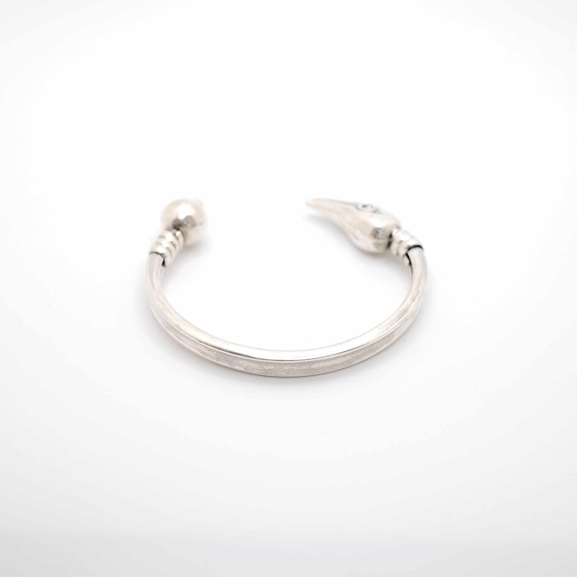 Crafted from fine and sterling silver, the crow’s head and sphere are traditionally sand-cast from hand-carved models, while the bridge is shaped through meticulous hammering. The result? A cuff that is both solid and refined—robust yet effortlessly elegant.