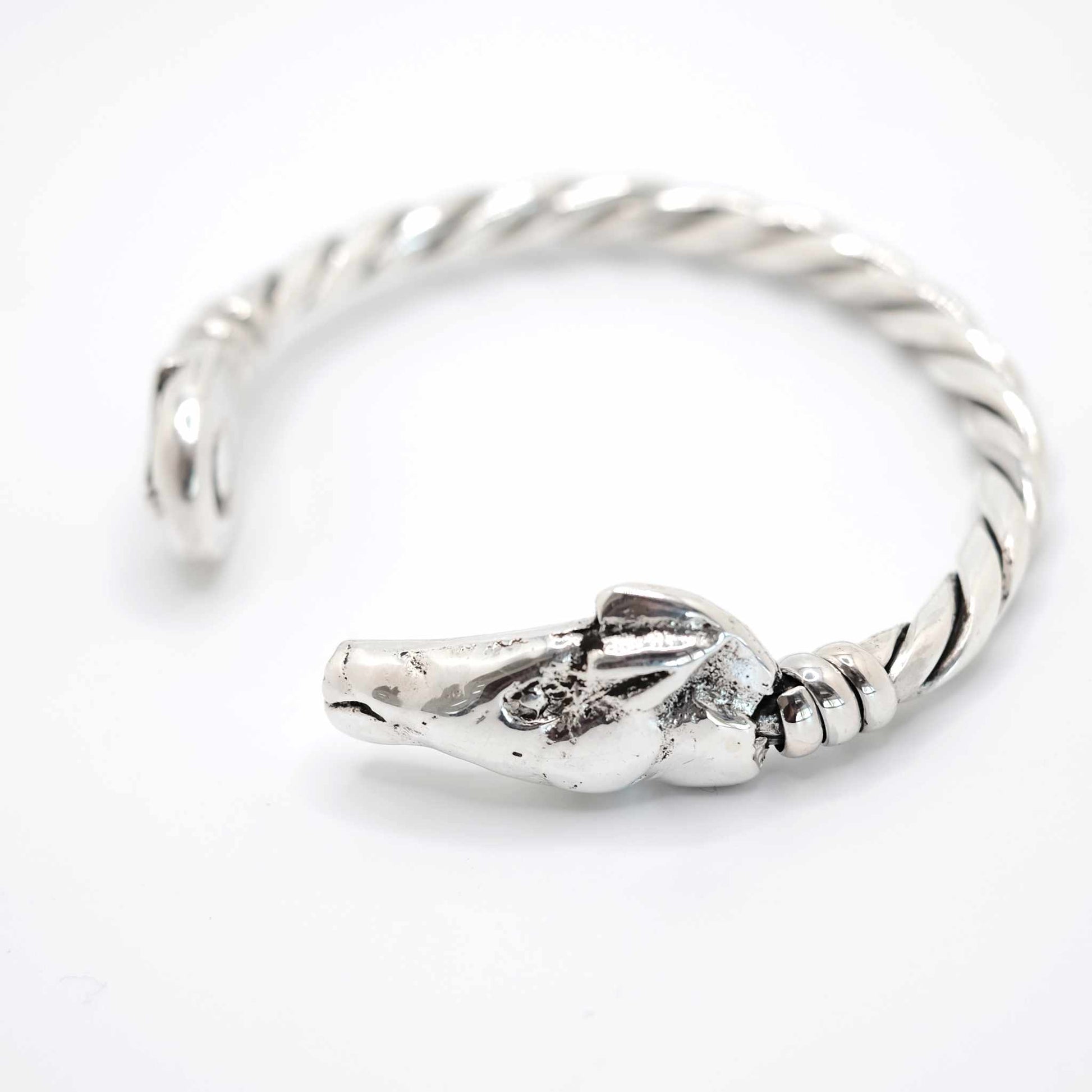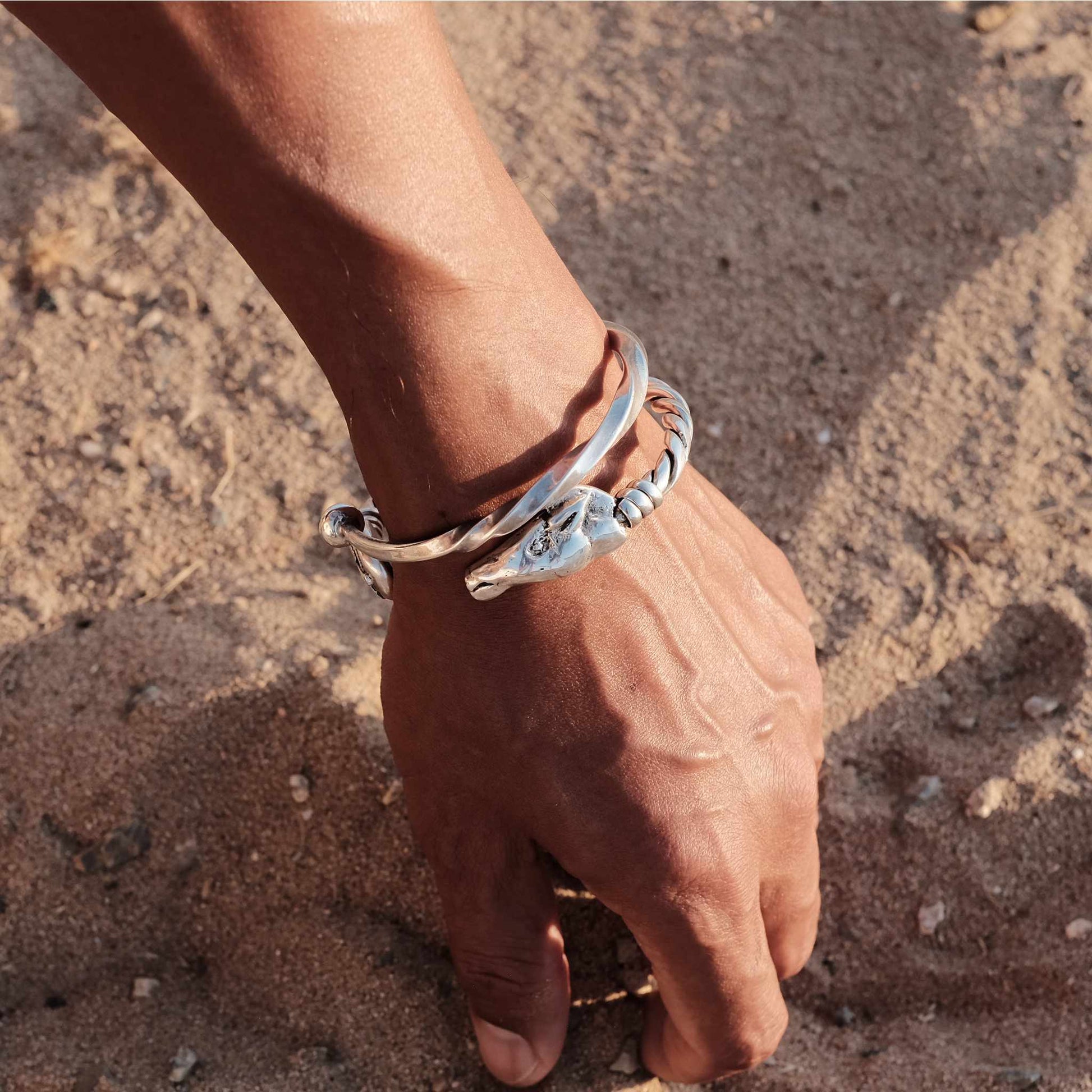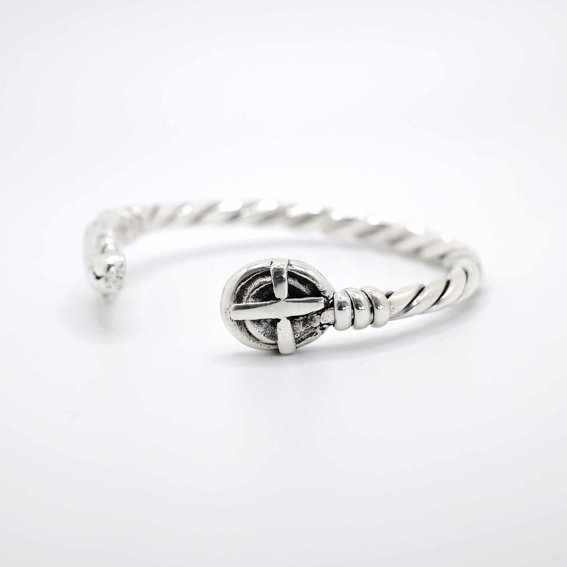 Crafted from fine and sterling silver, this cuff is a true work of craftsmanship. The horse head, hand-carved with subtle complexity, is traditionally sand-cast, while the three-wire twisted cuff is forged and tapered to perfection. On the opposite end, a cross symbol completes the design—representing balance, interconnectedness, and the ancient principle of as above, so below; as within, so without.