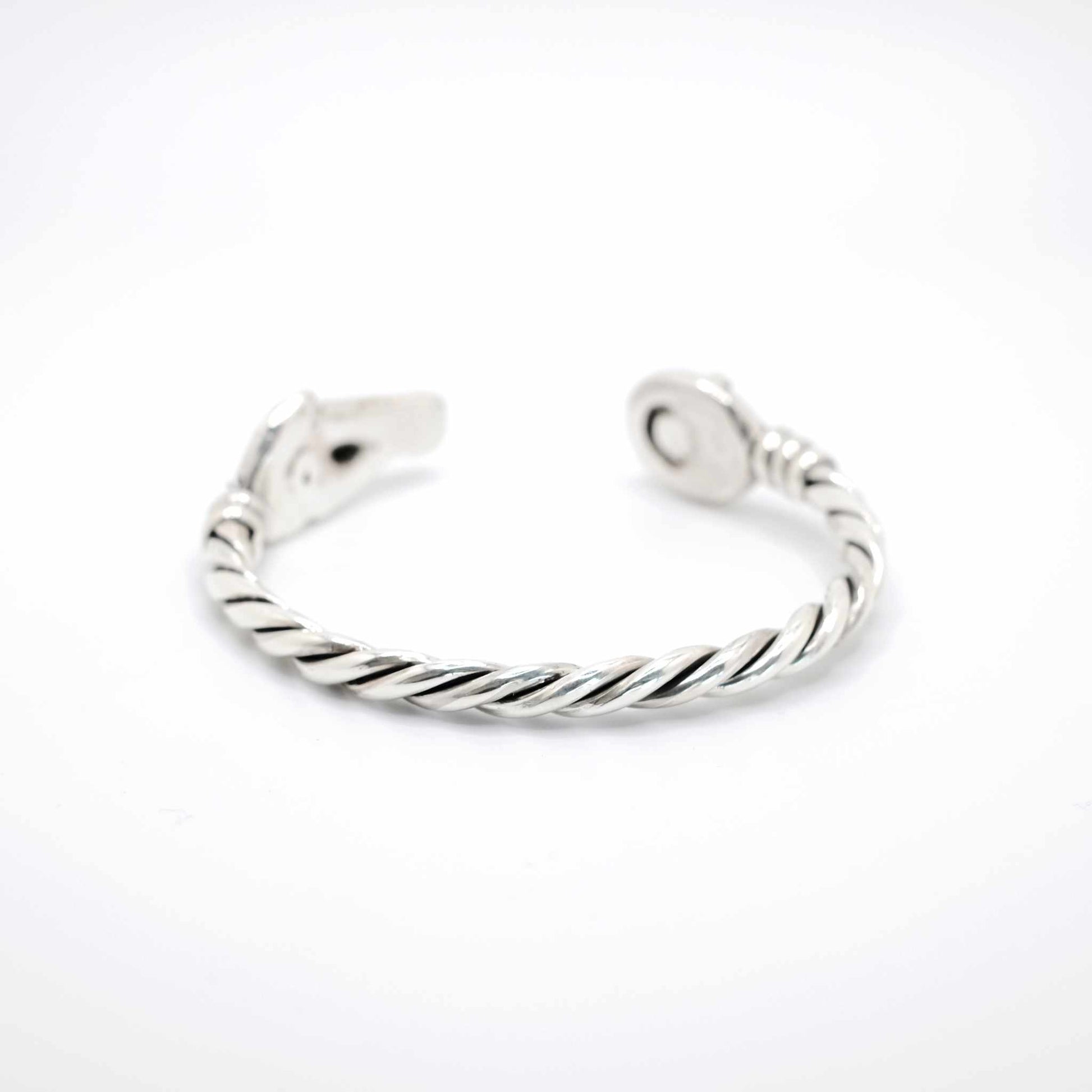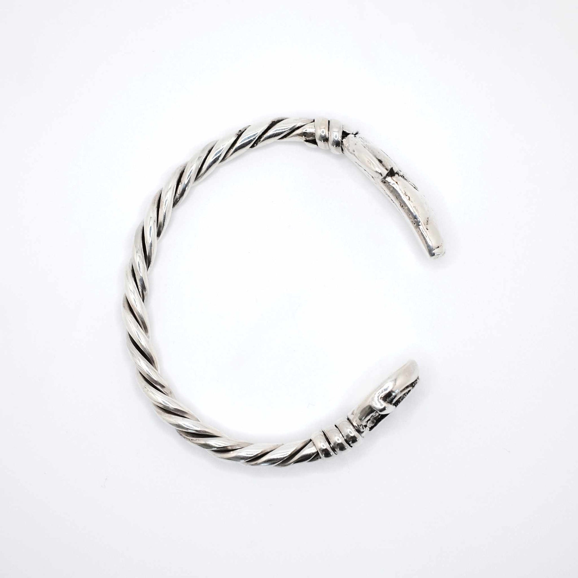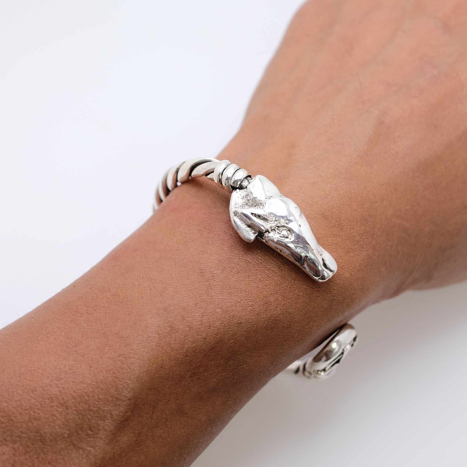 Crafted from fine and sterling silver, this cuff is a true work of craftsmanship. The horse head, hand-carved with subtle complexity, is traditionally sand-cast, while the three-wire twisted cuff is forged and tapered to perfection. On the opposite end, a cross symbol completes the design—representing balance, interconnectedness, and the ancient principle of as above, so below; as within, so without.