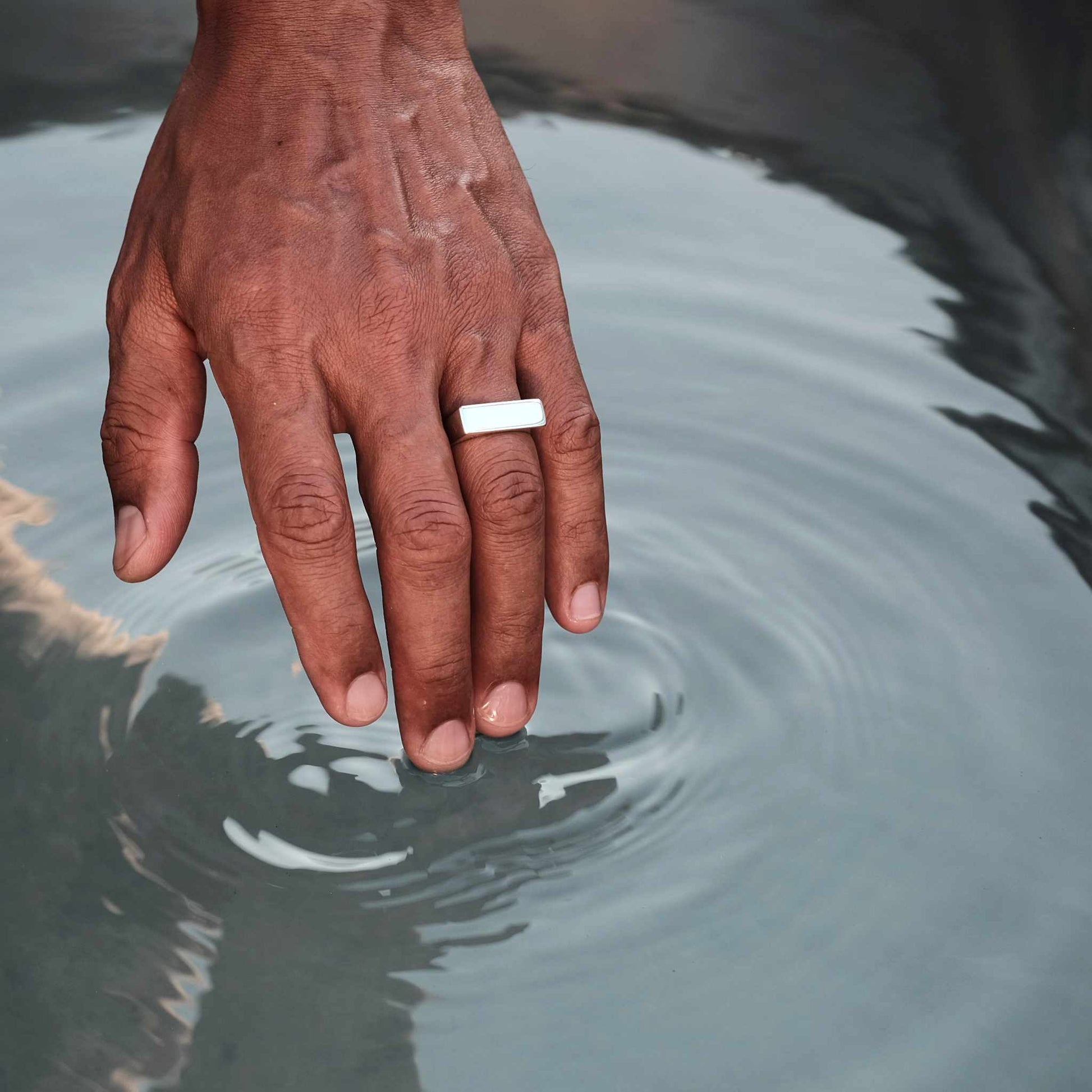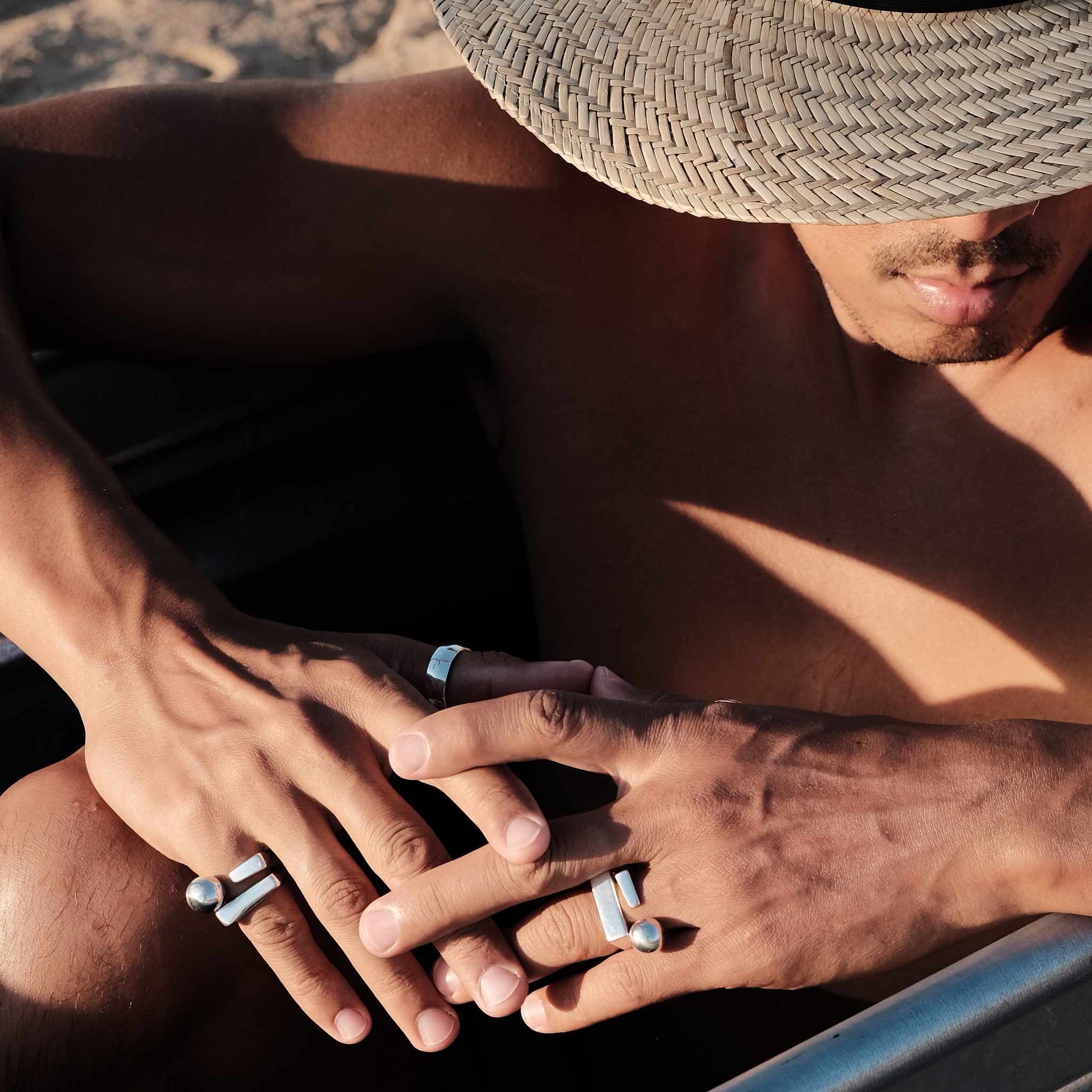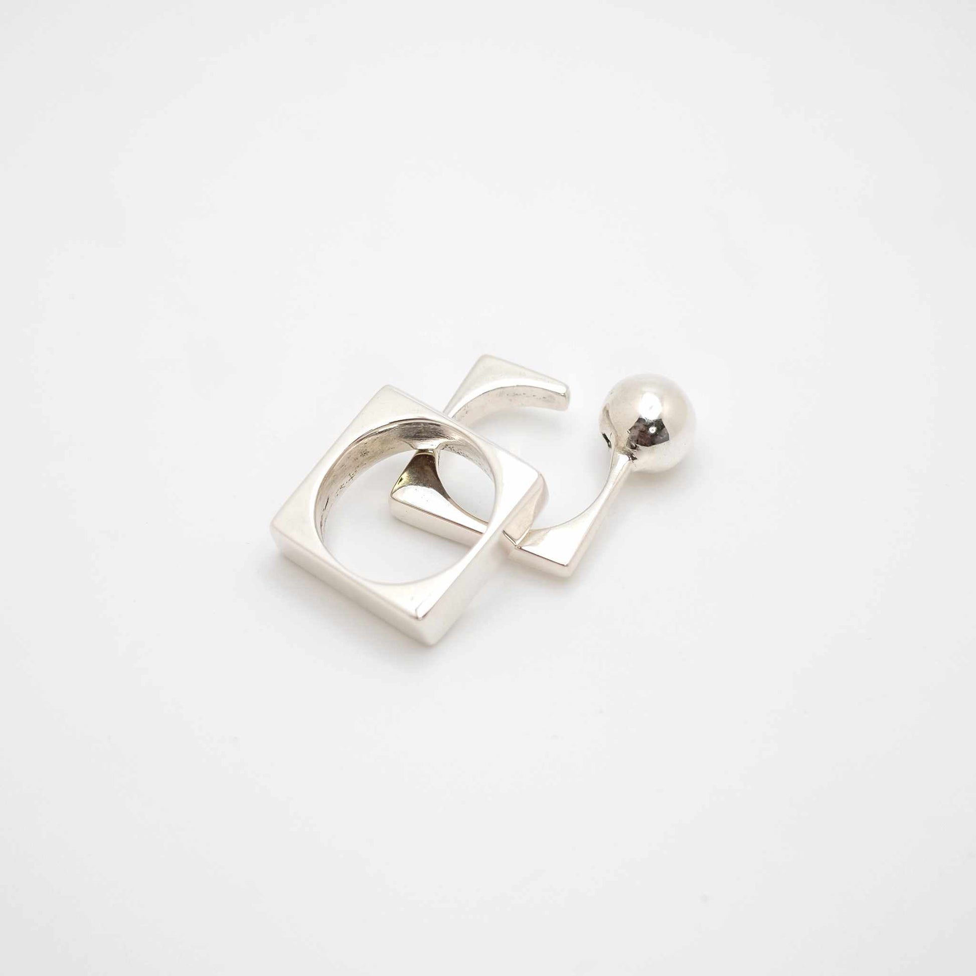 Together, these rings embody the five elements—earth, air, fire, water, and aether. The square and the sphere, rich in symbolism, create a striking balance of structure and fluidity. A truly unique pairing, they hold meaning beyond their form.